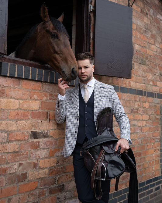 Elevate your Race Day style with the Bartela Blazer, featuring a striking check pattern for a refined yet contemporary look. Paired with the Malibu Navy Waistcoat and Trousers, this ensemble blends timeless elegance with modern sophistication. Perfect for race days, weddings, or making a stylish impression wherever you go.