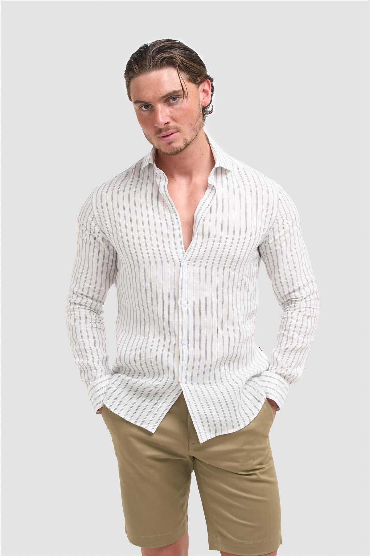The Alberi White Stripe Shirt is crafted from 100% linen, offering a lightweight, breathable handle with natural texture and character. Designed in a slim fit with a modern cutaway collar and subtle tonal stripe, it reflects classic European summer styling while maintaining a clean, contemporary profile.