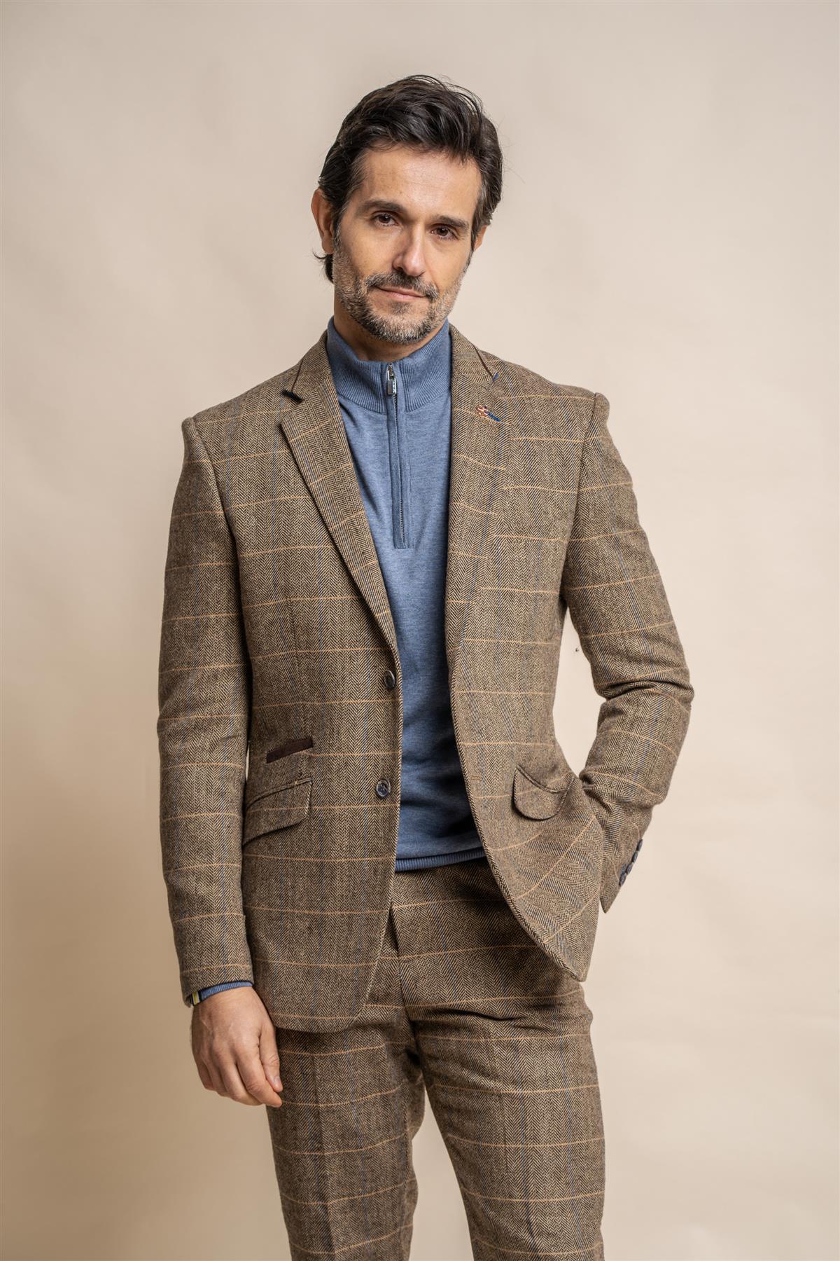 Effortlessly blending vintage charm with modern flair, the Albert Brown Tweed Blazer and Waistcoat pair perfectly with the sleek Dakota Navy Chinos. The rich brown tweed adds timeless sophistication, while the chinos provide comfort and versatility. Ideal for weddings, race days, or standout smart-casual occasions, this look is all about refined ease.