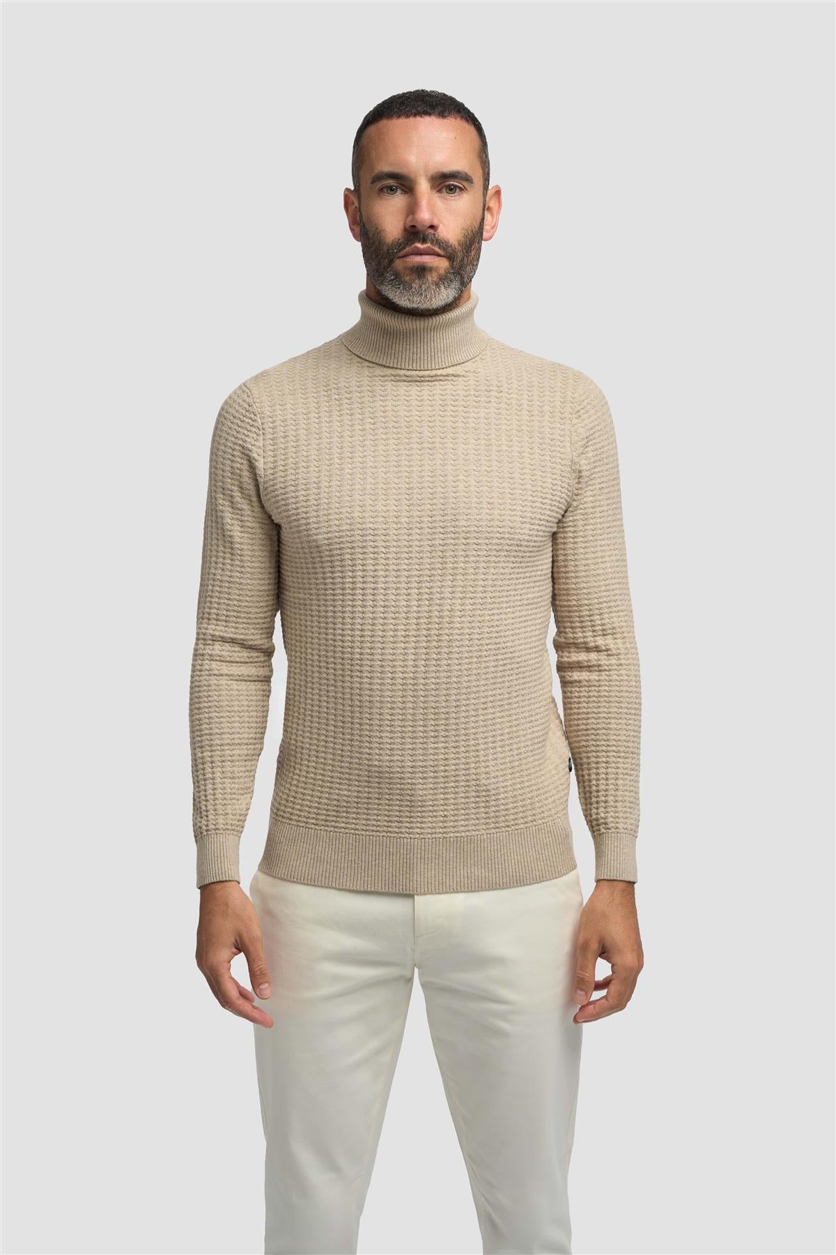Available in Brown, Fawn, and Navy, the Argas Roll Neck is a textured essential that combines everyday comfort with modern heritage knitwear.
